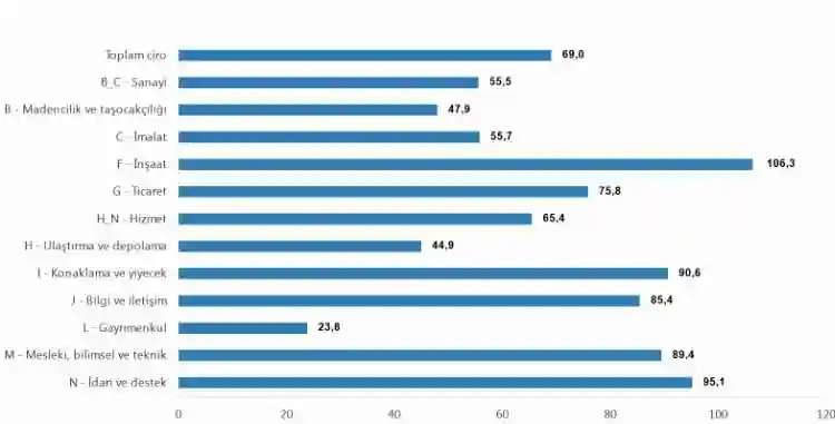 Sanayi, inşaat, ticaret ve hizmet sektörleri toplamında ciro endeksi (2015=100), 2023 yılı Ağustos ayında yıllık yüzde 69,0 arttı. Sektörlere göre inşaat ciro endeksi yüzde 106,3 artış gösterdi.