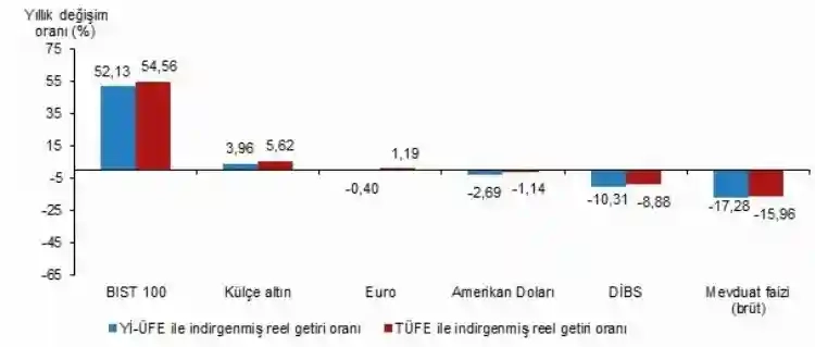 Finansal yatırım araçları yıllık olarak değerlendirildiğinde BIST 100 endeksi; Yİ-ÜFE ile indirgendiğinde yüzde 52,13, TÜFE ile indirgendiğinde ise yüzde 54,56 oranlarında yatırımcısına en yüksek reel getiri sağlayan yatırım aracı oldu.