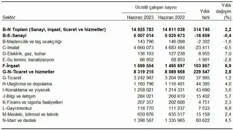 Ücretli çalışan sayısı bir önceki yılın aynı ayında 14 milyon 611 bin 38 kişi iken, 2023 yılı Haziran ayında 14 milyon 925 bin 783 kişi oldu.