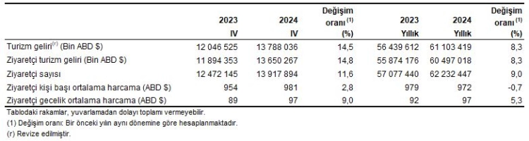 2024 yılının son çeyreğine ilişkin açıklanan Turizm İstatistiklerine göre 2024 yılında turizm geliri yüzde 8,3 artarken, turizm gideri yüzde 8,2 oranında azaldı. Turizm geliri içerisindeki paket tur harcamalarının payı yüzde 27,2 olurken, Türkiye'de geceleme yapan ziyaretçilerin gecelik ortalama harcaması 97 dolar oldu.