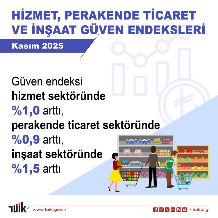 TÜİK, Hizmet, Perakende Ticaret ve İnşaat Güven Endeksleri'nde Kasım ayı verilerini yayımladı.