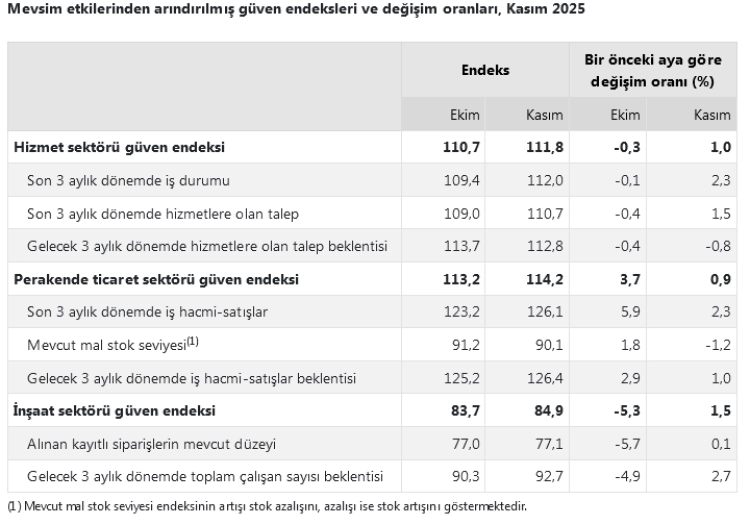 Mevsim etkilerinden arındırılmış verilere göre güven endeksi hizmet sektöründe yüzde 1,0 artışla 111,8, perakende ticaret sektöründe yüzde 0,9 artışla 114,2, inşaat sektöründe yüzde 1,5 artışla 84,9 seviyesine yükseldi.