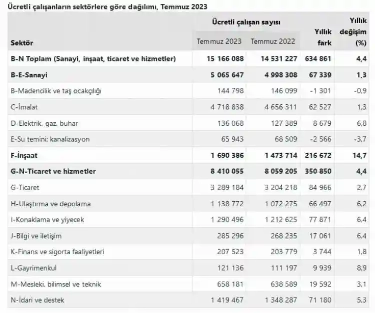 Buna göre, sanayi, inşaat ve ticaret-hizmet sektörleri toplamında ücretli çalışan sayısı Temmuz'da bir önceki yılın aynı ayına göre yüzde 4,4 arttı. Ücretli çalışan sayısı bir önceki yılın aynı ayında 14 milyon 531 bin 227 kişi iken, 2023 yılı Temmuz ayında 15 milyon 166 bin 88 kişi oldu.
