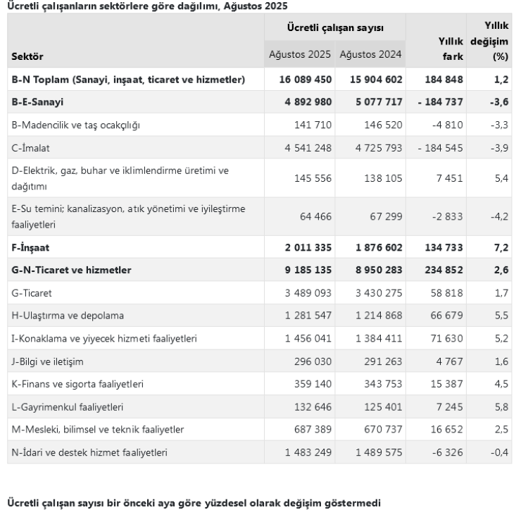 Ticaret-hizmet sektörü yüzde 2,6’lık artışla büyümeyi sürüklerken, sanayi yüzde 3,6 azaldı.TÜİK verilerine göre, ücretli çalışan sayısı Ağustos 2025’te 15 milyon 904 bin 602’den 16 milyon 89 bin 450’ye çıktı.