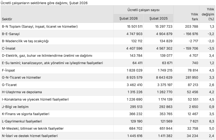 TÜİK verilerine göre, ücretli çalışan sayısı Şubat 2026’da yıllık bazda artarken, en güçlü yükseliş inşaat ve hizmet sektörlerinde görüldü.Veriler, istihdamda sınırlı ancak dengeli bir büyümenin sürdüğünü gözler önüne serdi.