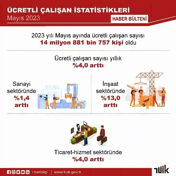 TÜİK'in Mayıs ayı verilerine göre ücretli çalışan sayısı, Mayıs'ta geçen yılın aynı ayına göre yüzde 4 oranında artış gösterdi.