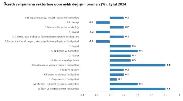 Bu arada sanayi, inşaat ve ticaret-hizmet sektörleri toplamında ücretli çalışan sayısı 2024 Eylül ayında bir önceki aya göre yüzde 0,2 artarken; ücretli çalışanların alt detaylarına bakıldığında 2024 Eylül ayında ücretli çalışanlar aylık olarak sanayi sektöründe yüzde 0,2 azaldı, inşaat sektöründe yüzde 0,3 arttı ve ticaret-hizmet sektöründe yüzde 0,4 arttı.