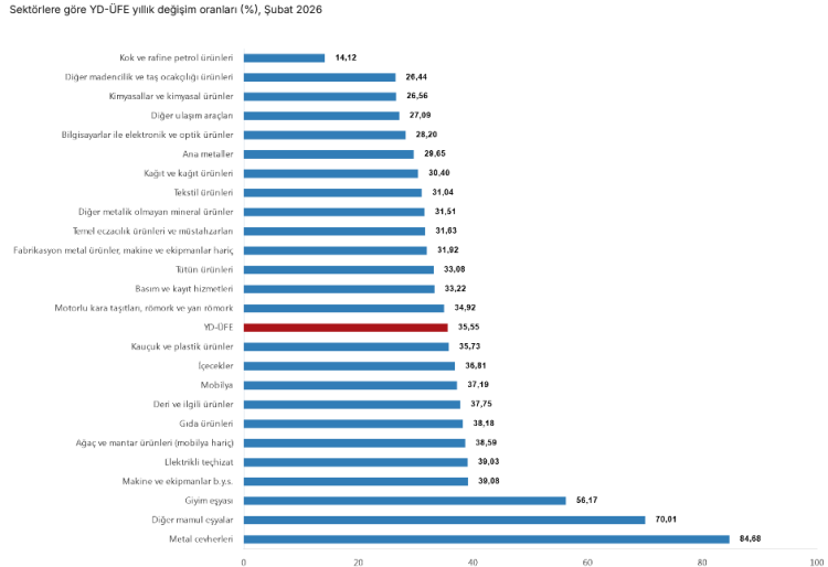 Türkiye İstatistik Kurumu, 2026 yılı Şubat ayına ilişkin Yurt Dışı Üretici Fiyat Endeksi (YD-ÜFE) verilerini açıkladı. Buna göre endeks, bir önceki aya göre yüzde 2,38, yılın başına göre yüzde 6,53 ve geçen yılın aynı ayına göre yüzde 35,55 artış kaydetti. 12 aylık ortalamalara göre artış ise yüzde 28,90 oldu.