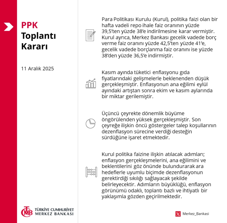 Ekim ayında gerçekleştirilen PPK toplantısında politika faizi olan bir hafta vadeli repo ihale faiz oranının yüzde 40,5'ten yüzde 39,5’e indirilmesine karar veren Merkez Bankası, yılın son faiz kararını açıkladı.