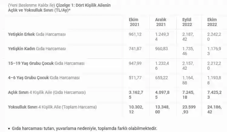 Buna göre, 4 kişilik bir ailenin sağlıklı, dengeli ve yeterli beslenebilmesi için yapması gereken aylık gıda harcaması tutarı (açlık sınırı) 7 bin 425 lira 23 kuruşa, gıda harcaması ile giyim, konut (kira, elektrik, su, yakıt), ulaşım, eğitim, sağlık ve benzeri ihtiyaçlar için yapılması zorunlu diğer aylık harcamalarının toplam tutarı (yoksulluk sınırı) 24 bin186 lira 42 kuruşa çıktı.