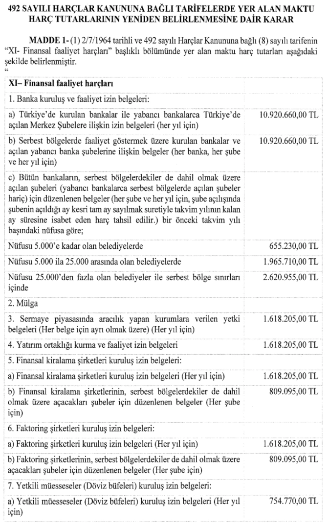 Ayrıca “492 Sayılı Harçlar Kanununa Bağlı Tarifelerde Yer Alan Maktu Harç Tutarlarının Yeniden Belirlenmesine Dair Karar (Karar Sayısı: 10382)” ile 2 Temmuz 1964 tarihli ve 492 sayılı Harçlar Kanunu’nun mükerrer 138. maddesi kapsamında maktu harç tutarları güncellenerek bugün itibariyle yürürlüğe girdi.
