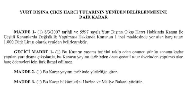 “Yurt Dışına Çıkış Harcı Tutarının Yeniden Belirlenmesine Dair Karar (Karar Sayısı: 10381)” ile 8 Mart 2007 tarihli ve 5597 sayılı Yurt Dışına Çıkış Harcı Hakkında Kanun’un 1. maddesinde yer alan harç tutarı, 710 TL’den 1000 TL’ye yükseltildi.