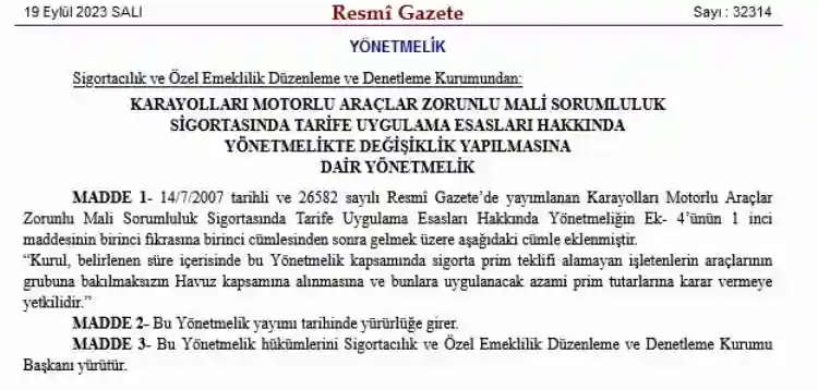 Buna göre, SEDDK, belirlenen süre içinde sigorta prim teklifi alamayanların araçlarının, bulunduğu risk grubuna bakılmaksızın Riskli Sigortalılar Havuzu kapsamına alınmasına ve bunlara uygulanacak azami prim tutarlarına karar vermeye yetkili olacak.
