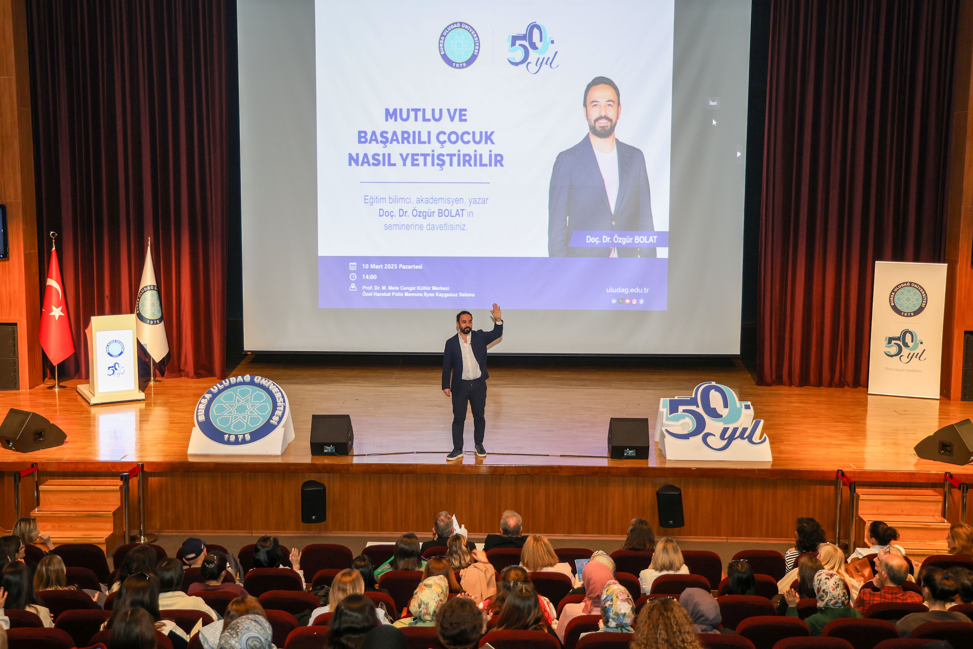 Dinleyicilerden gelen cevaplarla interaktif bir sunum yapan Doç. Dr. Özgür Bolat ise günümüzde birçok insanın bireysel başarılarıyla mutlu olmaya çalıştıklarını ve bunun devamı için sürekli başarılı olması gerektiğini açıkladı. Çocuk yetiştirmenin bireyin kendini yetiştirmesiyle mümkün olabileceğinin altını çizen Bolat, "Kazanmaya bağlı bir mutluluk sürdürülebilir değildir. Onun için bir ortamda öğretmen veya aile ne kadar çok ödül kullanırsa, çocuk da o kadar performans odaklı olur ve kolay işleri seçer. Bu da gelişimi durdurur ve ilerleyemez. Onun için çocuklarımızı asla performans odaklı yetiştirmemeliyiz" diye konuştu.
