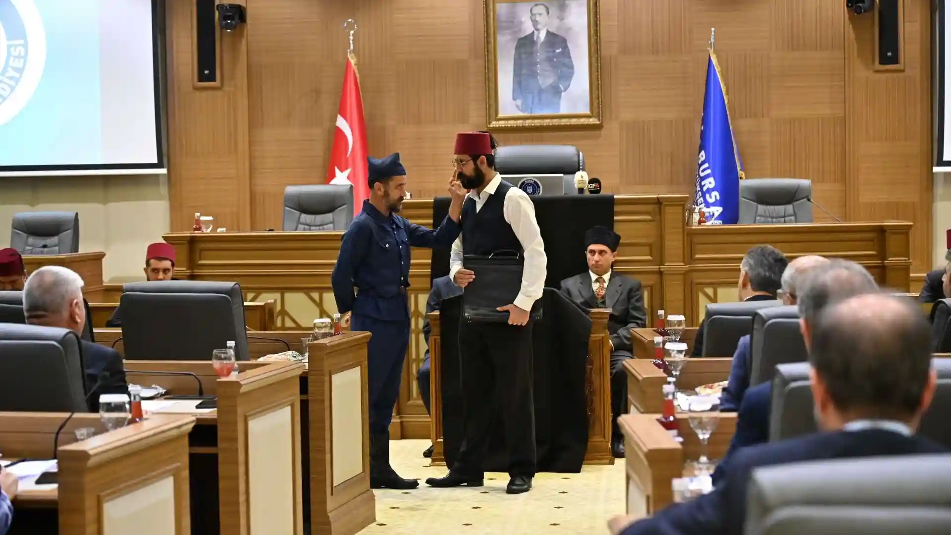 Bursa’nın Yunan işgalinde yaşadığı acılar ve 101 yıl önce yaşanan kurtuluş sevinci, Şehir Tiyatrosu oyuncuları tarafından Büyükşehir Belediye Meclisi’nin Eylül ayı oturumunda, kısa bir oyunla yeniden gözler önüne serildi.