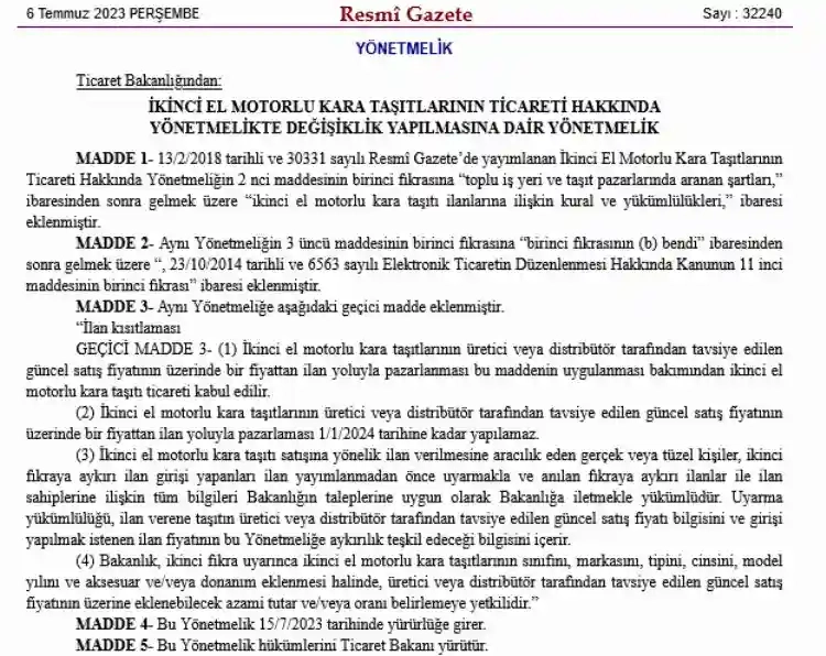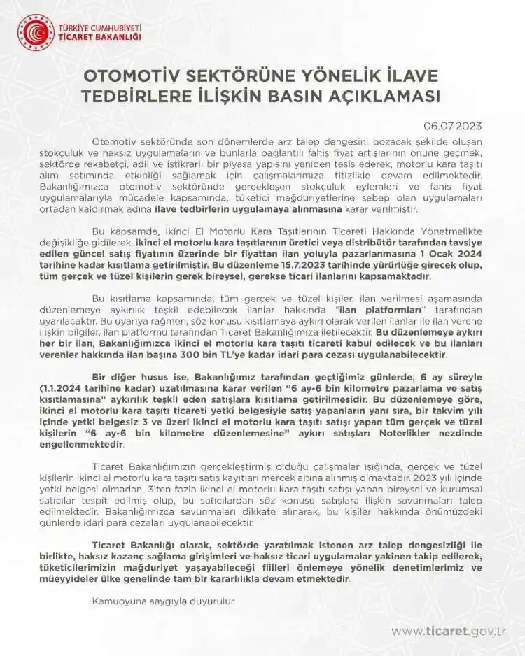 İkinci el araçların üretici veya distribütörce tavsiye edilen güncel satış fiyatının üzerinde fiyattan ilanla pazarlanmasına 2024'e kadar kısıtlama getirildi. Resmi Gazete'de yayımlanan ve 15 Temmuz'da yürürlüğe girecek karar sonrasında Ticaret Bakanlığı, sektöre yönelik ilave tedbirlere yönelik basın açıklaması yaptı.