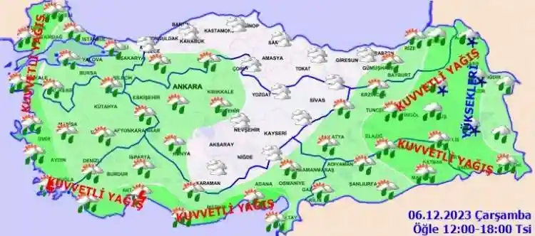 KUVVETLİ YAĞIŞ UYARISI: Genellikle yağmur ve sağanak, Ege ve Akdeniz kıyılarının yer yer gök gürültülü sağanak şeklinde görülecek yağışların; Marmara'nın batısı, Kıyı Ege, Akdeniz kıyıları, Güneydoğu Anadolu'nun doğusu, Doğu Anadolu (Van, Malatya, Erzincan ve Iğdır dışında) ile Artvin çevrelerinde yer yer kuvvetli, Muş, Bingöl, Siirt ve Batman çevrelerinde yer yer çok kuvvetli ve şiddetli olması beklendiğinden yaşanabilecek olumsuz şartlara karşı (ani sel, su baskını, ulaşımda aksamalar vb) dikkatli ve tedbirli olunması gerekmektedir.