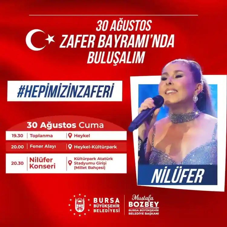 Bursa Büyükşehir Belediyesi’nin, “Hepimizin Zaferi” sloganıyla hazırladığı 30 Ağustos Zafer Bayramı programı, saat 19:30’da Heykel’deki Tarihi Büyükşehir Belediye Binası önünden fener alayıyla başlayacak. Binlerce Bursalının Türk bayraklarıyla katılacağı yürüyüşün ardından Sanatçı Nilüfer'in konseriyle devam edecek. Konser 20:30'da Millet Bahçesi'nde bulunan Kültürpark eski Atatürk Stadyumu girişinde halkla buluşacak.