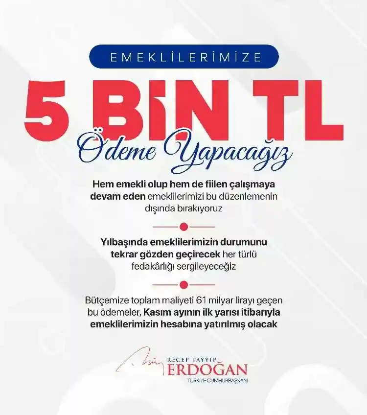 Cumhurbaşkanı Erdoğan, emeklilere bir defaya mahsus olmak üzere 5 bin lira ödeme yapmayı kararlaştırdıklarını, ödemelerin Kasım ayının ilk yarısı itibarıyla emeklilerin hesabına yatırılmış olacağını belirterek, emekli olup fiilen çalışmaya devam edenlerin bu düzenlemenin dışında bırakılacağını kaydetti.