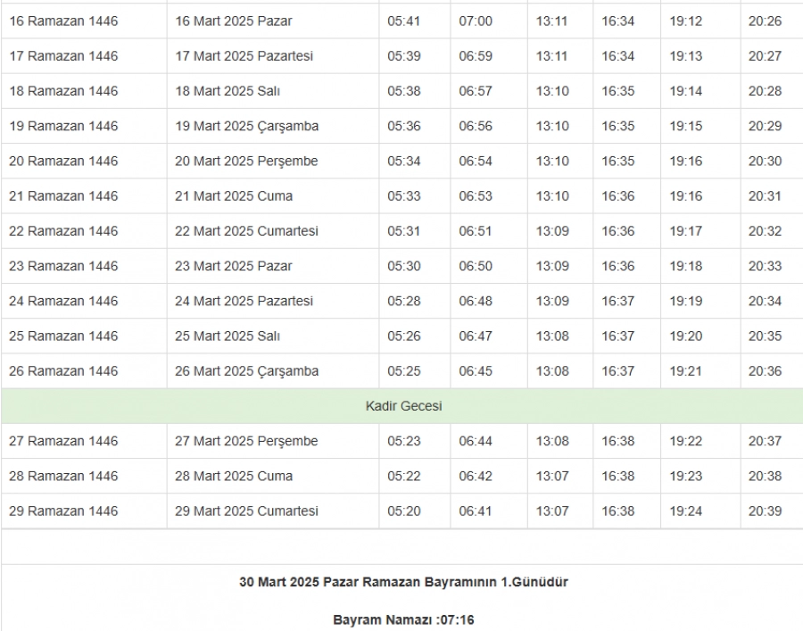 Diyanet İşleri Başkanlığının yayımladığı saatlere göre 2025 yılı Ramazan ayı imsak saatleri...