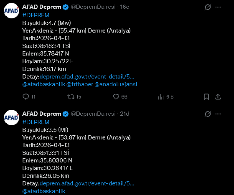 AFAD, Antalya’nın Demre ilçesi açıklarında kısa aralıklarla 3,5 ve 4,7 büyüklüğünde iki deprem meydana geldiğini duyurdu.