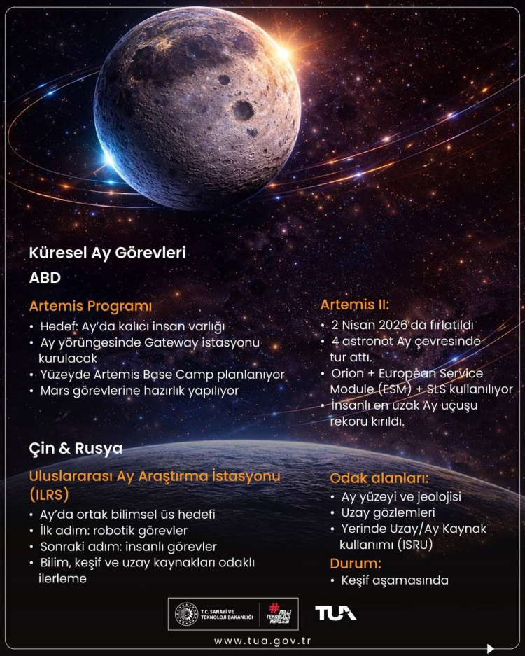 Türkiye Uzay Ajansı, Artemis II sonrası yaptığı açıklamada Ay’ın artık yalnızca keşif değil, teknoloji ve güç rekabetinin merkezi haline geldiğini vurguladı. Türkiye’nin ise AYAP ile bu yarışta aktif rol almayı hedeflediği belirtildi