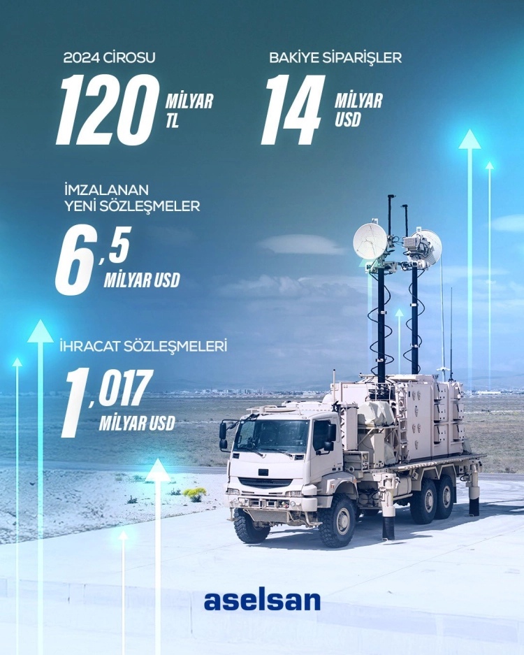 İhracatta hem tutar, hem de oransal bazda kuvvetli büyüme sağlayan ASELSAN, 2024 yılı cirosunda Hava Savunma, Radar, Elektronik Harp, Güdüm, Aviyonik, Elektro-Optik, Deniz Sistemleri ve Askeri Haberleşme Sistemlerine yönelik teslimatlar önemli pay oluşturdu.