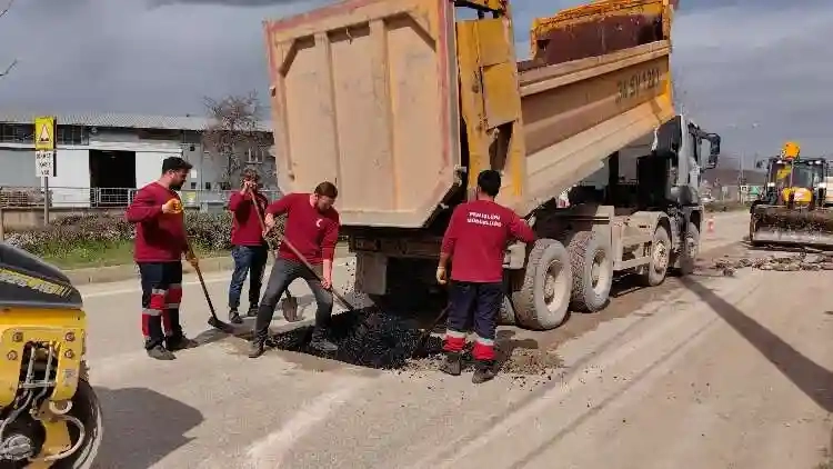 80 ile 200 derece sıcaklıkta eritilen asfalt yollara döküyor