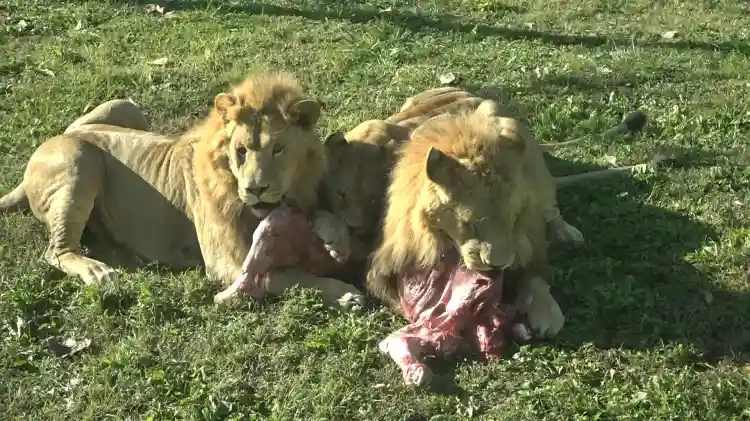 Bursa Büyükşehir Belediyesi'ne ait hayvanat bahçesinde aslanların bakıcıları tarafından bırakılan karkas olarak bırakılan yaklaşık 50 kiloluk eti, iştahla midelerine indirdi. Yaklaşık 206 bin metrekarelik bir saha üzerine kurulu bulunan Bursa Hayvanat Bahçesi'nde bir aslanın günde ortalama 5-6 kilogram et yediğini belirten yetkililer, günün bir kısmını dinlenerek geçiren bu vahşi kedilerin beslenme ve davranış zenginleştirme programına tabi tutulduğunu söyledi. Tabiatta zamanlarının büyük bir kısmını yiyecek bulmak, yuva yapmak ve kendi hakimiyet alanlarını korumak için geçiren aslanların hayvanat bahçesinde veteriner, biyolog ve yetkililer tarafından kalorileri tek tek hesaplanan gıdalarla beslenirken, vatandaşlarla onları ilgiyle izledi.