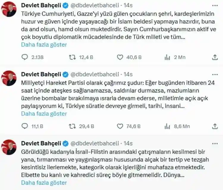Bahçeli, paylaşımlarında; "Eğer bugünden itibaren 24 saat içinde ateşkes sağlanamazsa, saldırılar durmazsa, mazlumların üzerine bombalar bırakılmaya ısrarla devam ederse, milletimle açık açık paylaşıyorum ki, Türkiye süratle devreye girmeli, tarihi, insani ve inanç sorumluluğunun gereği her neyse yapmalıdır. Gazze’yi koruma ve kollama misyonunu üstlenmek bize ecdadımızın mirasıdır. Türkiye Cumhuriyeti, Gazze'yi yüzü gülen çocukların şehri, kardeşlerimizin huzur ve güven içinde yaşayacağı bir İslam beldesi yapmaya hazırdır, buna da and olsun, hamd olsun muktedirdir. Sayın Cumhurbaşkanımızın aktif ve çok boyutlu diplomatik mücadelesinde de Türk milleti ve tüm inananlar yanındadır" ifadelerine yer verdi.