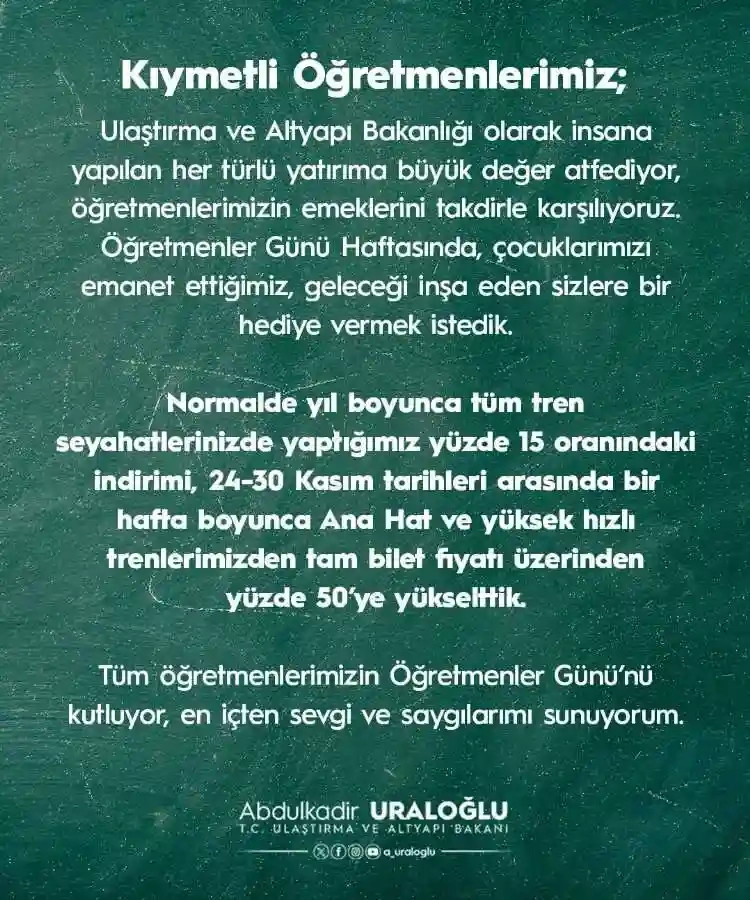 Ulaştırma ve Altyapı Bakanı Abdulkadir Uraloğlu, 24 Kasım Öğretmenler Günü nedeniyle 24-30 Kasım tarihleri arasında öğretmenlere yüzde 50 indirim uygulanacağını açıkladı.