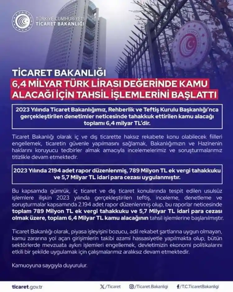 Ticaret Bakanlığı 6,4 milyar TL değerinde kamu alacağı için tahsil işlemlerini başlattı.