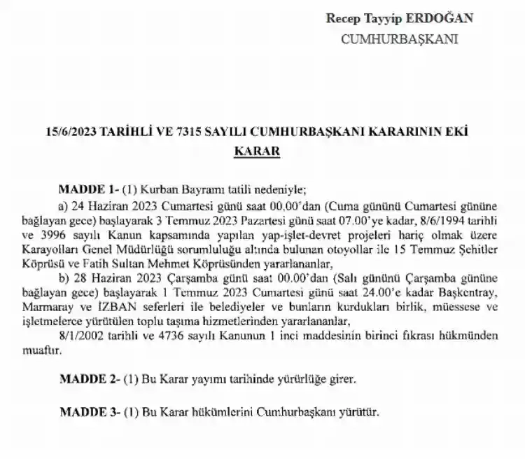 Bayram tatili boyunca devletin işlettiği köprü ve otoyolların ücretsiz olmasına ilişkin Cumhurbaşkanı kararı Resmi Gazete'de yayımlandı.