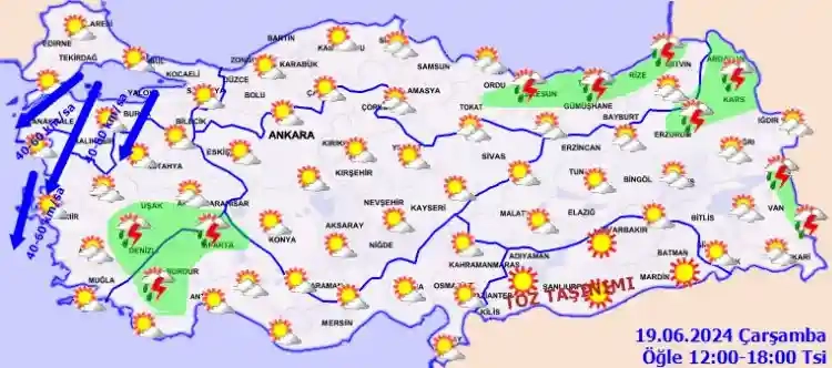 Meteoroloji Genel Müdürlüğü tarafından yapılan son tahminlere göre; Ülkemizin kuzeydoğusu ile Güney Ege ve Akdeniz'in iç kesimlerinin parçalı ve yer yer çok bulutlu, Doğu Karadeniz kıyı illeri, Doğu Anadolu’nun kuzeydoğusu, Denizli, Uşak ve Burdur ile Isparta'nın kuzey ve batı, Afyonkarahisar'ın güney, Van'ın doğu kesimlerinin yerel sağanak ve gök gürültülü sağanak yağışlı, diğer yerlerin az bulutlu ve açık geçeceği tahmin ediliyor. Güneydoğu Anadolu Bölgesinde toz taşınımı bekleniyor.