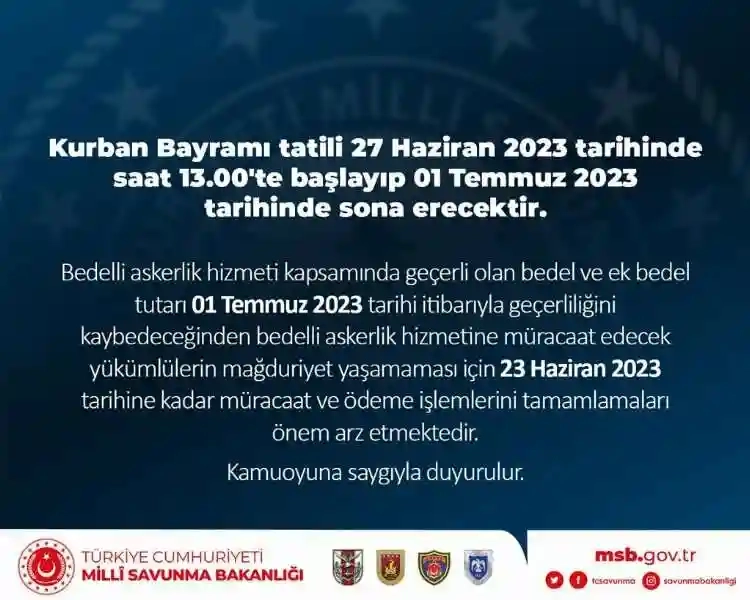 Bedelli askerlik hizmeti kapsamında geçerli olan bedel ve ek bedel tutarının 1 Temmuz 2023 itibariyle geçerliliğini kaybedeceğinden bedelli askerlik hizmetine müracaat edecek yükümlülerle ilgili uyarıda bulunan Milli Savunma Bakanlığı, yükümlülerin mağduriyet yaşamaması için 23 Haziran 2023 tarihine kadar müracaat ve ödeme işlemlerini tamamlanmalarını istedi.