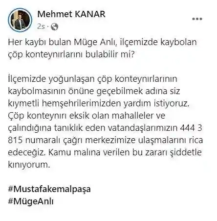Bursa'nın Mustafakemalpaşa Belediye Başkanı Mehmet Kanar, yaptığı paylaşımda Müge Anlı’ya seslendi. Bugüne kadar onlarca çöp konteynerinin kaybolması üzerine çaresizlik içinde kalan Başkan Kanar’ın talebi sosyal medyada büyük dikkat çekti.