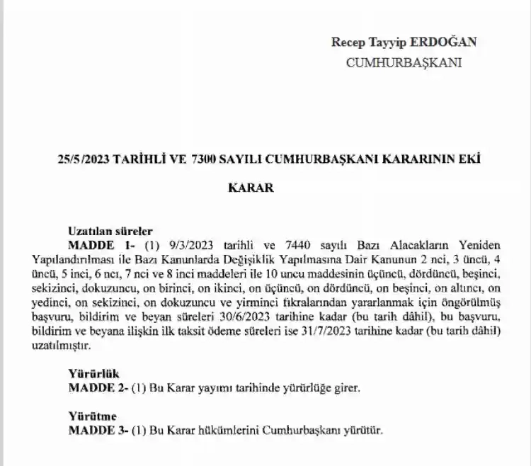 İlk taksit ve peşin ödeme tarihleri için ise 31 Temmuz'a kadar ek süre tanındı.