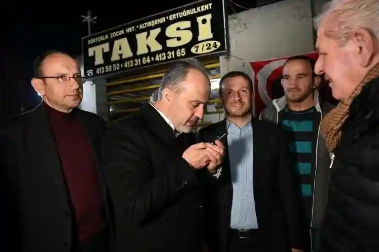 Büyükşehir Belediye Başkanı Alinur Aktaş, 2023'ün son saatlerinde görev başındaki itfaiye ve emniyet görevlilerini ziyaret etti. Beraberindeki AK Parti Bursa Milletvekili Mustafa Yavuz ve Ahmet Kılıç, AK Parti İl Başkan Yardımcıları Kamil Bayramiç ve Ferhat Erol, AK Parti Nilüfer İlçe Başkanı Furkan Alpaslan ile birlikte ilk olarak Küçük Sanayi’deki İtfaiye Daire Başkanlığı binasını ziyaret eden Başkan Alinur Aktaş, görev başındaki itfaiyecilerle bir araya gelip sohbet ederek baklava ve boza ikramında bulundu. Başkan Aktaş, Bursalıların rahat ve huzur içinde bir gece geçirmesi için sabaha kadar görev başında olan emniyet güçlerini de unutmadı. Özlüce Mahallesi Ahmet Taner Kışlalı Bulvarı’ndaki emniyet kontrol noktasına uğrayarak burada görevli polisleri ziyaret eden Başkan Aktaş, görevi başındaki emniyet mensuplarına başarılar dileyerek tatlı ikram etti. Daha sonra Ertuğrul Taksi Durağı’nı ziyaret eden Başkan Aktaş, taksici esnafıyla sohbet ederek durak telsizinden yaptığı anonsla direksiyon başında olan taksicilerin yeni yılını kutladı. Durakta çalan telefonu da açan Başkan Aktaş, arayan vatandaşın da yeni yılını tebrik edip taksi için adresi aldı.