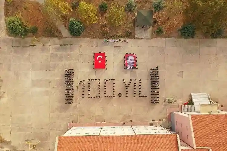230’a yakın öğrenci ve öğretmenleri ile birlikte okul bahçesinde 100. Yıl koreografisi yaptı.