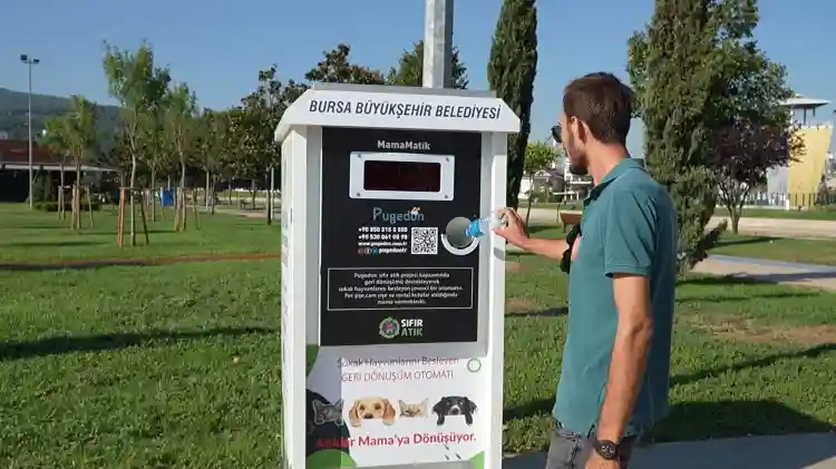 Bursa Büyükşehir Belediyesi, kentin farklı noktalarına yerleştirdiği 'mamamatik' otomatlarıyla plastik, metal ve cam gibi atıkların hem geri dönüşümünü sağlıyor hem de can dostlar için mamaya dönüştürüyor.
