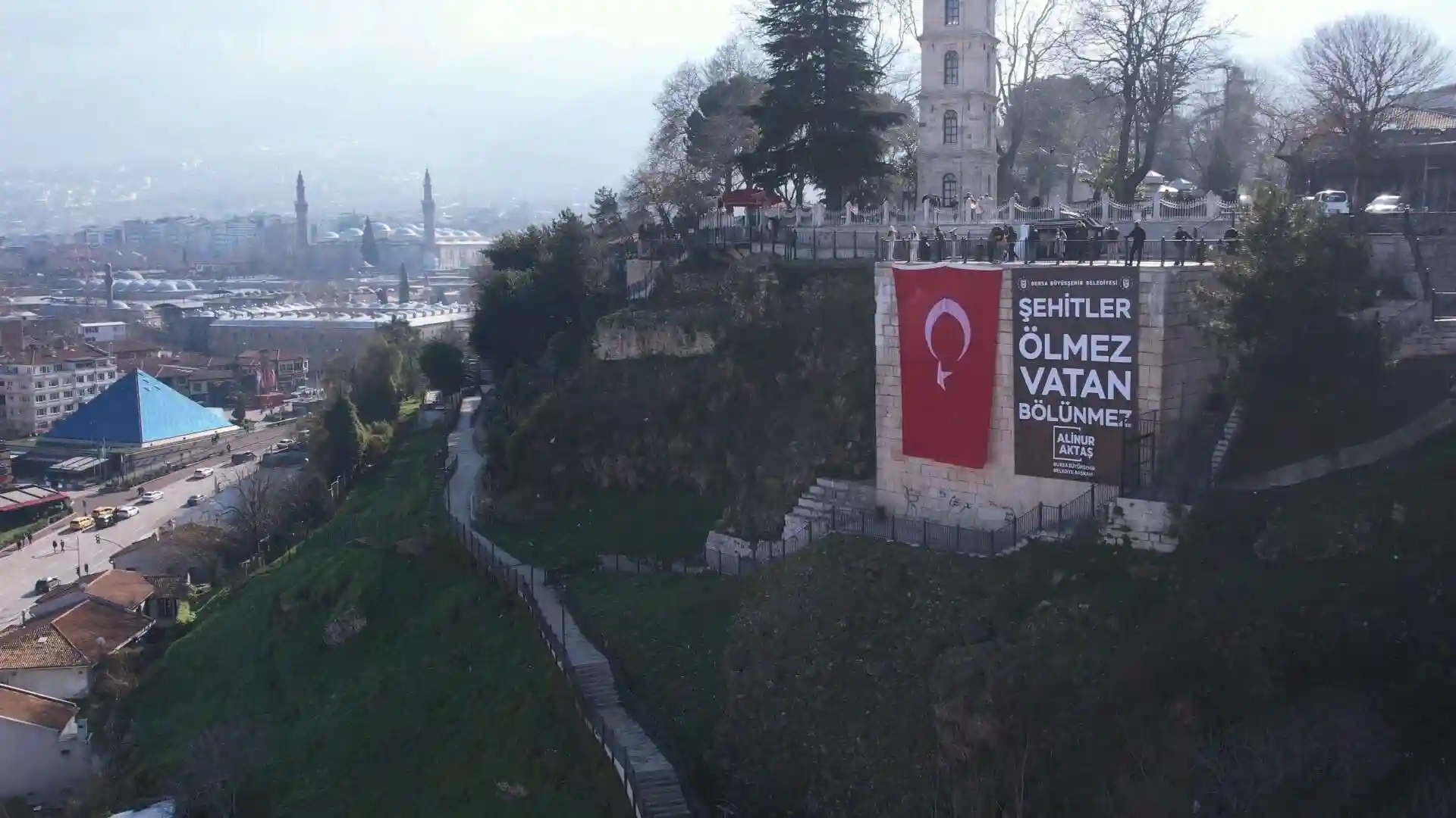 Bursa'da 2700 yıllık Tophane surlarına dev "Şehitler ölmez, vatan bölünmez" pankartı ve Türk Bayrağı asıldı.
