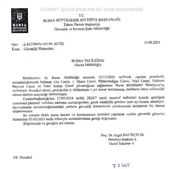Bursa Valiliği ve Bursa Müftülüğüne 13.09.2024 tarihinde Bursa Büyükşehir Belediyesi Zabıta Daire Başkanlığı ve Güvenlik ve Koruma Şube Müdürlüğü tarafından gönderilen ek protokol yazısında Cumhurbaşkanlığının 17/05/2024 tarihli 2024/7 sayılı tasarruf tedbirleri konulu genelgesi uyarısınca personel istihdam edilmesi zorlaştığından; gerek emeklilik gerek se işten ayrılmalar sebebiyle mevcudumuz sorumluluğumuzdaki yerlerin güvenlik hizmetlerini yürütmemizi zorlaştıran bir durum oluşmuştur. Bu sebeple farklı kamu kurum ve kuruluşlarına protokol yapılarak verilen güvenlik görevlisi hizmetinin 01/02/2025 tarihi itibariyle sonlandırılması gereği doğmuştur" denildi.