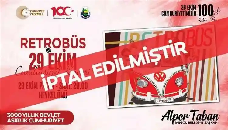 Bursa'da İnegöl Belediyesi’nin 22 Ekim’de gerçekleştireceği Cerrah Fasulye Şenliği ile 29 Ekim’de yapılması planlanan Retrobüs ile 29 Ekim Cumhuriyet Konseri, Filistin’de yaşanan insanlık dramı nedeniyle iptal edildi.