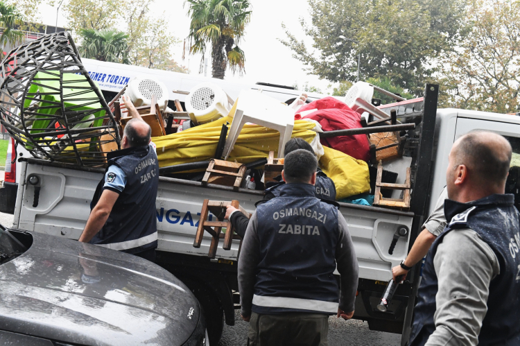 Osmangazi Belediyesi zabıta ekipleri yayaların kullanımı için ayrılan kaldırımlara masa, sandalye, şemsiye ile araç parkını engelleyen duba ve reklam amaçlı flamalar koyan işletmelerin eşyalarını toplayarak cezai işlem uyguladı.