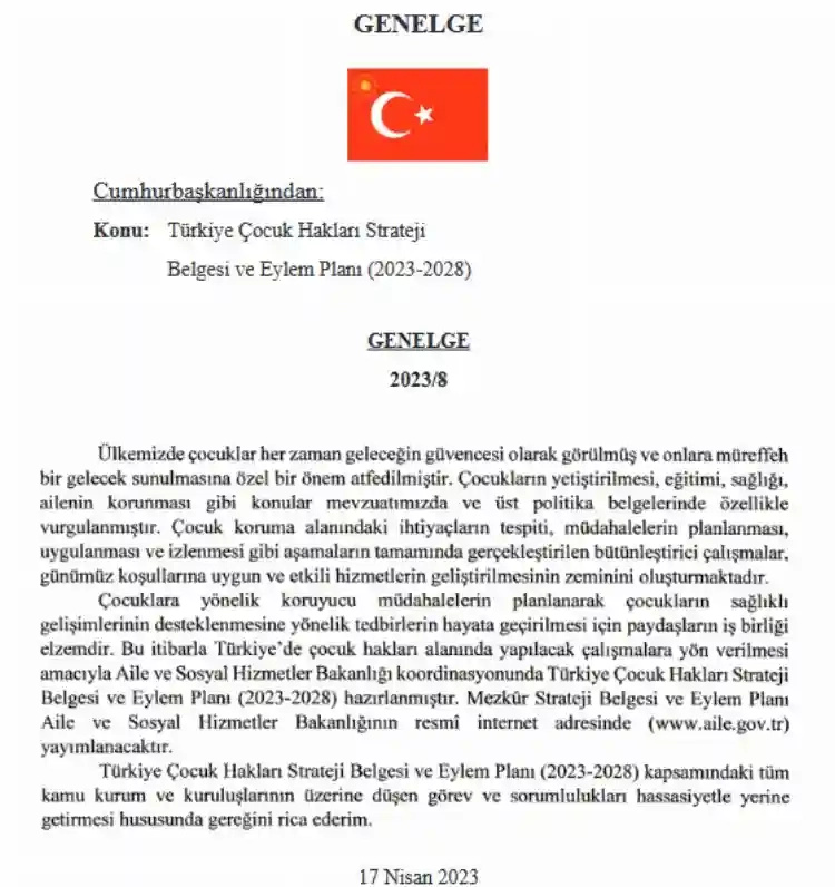 "Bu itibarla Türkiye'de çocuk hakları alanında yapılacak çalışmalara yön verilmesi amacıyla Aile ve Sosyal Hizmetler Bakanlığı koordinasyonunda Türkiye Çocuk Hakları Strateji Belgesi ve Eylem Planı (2023-2028) hazırlanmıştır. Mezkûr Strateji Belgesi ve Eylem Planı Aile ve Sosyal Hizmetler Bakanlığının resmî internet adresinde (www.aile.gov.tr) yayımlanacaktır. Türkiye Çocuk Hakları Strateji Belgesi ve Eylem Planı kapsamındaki tüm kamu kurum ve kuruluşlarının üzerine düşen görev ve sorumlulukları hassasiyetle yerine getirmesi hususunda gereğini rica ederim."
