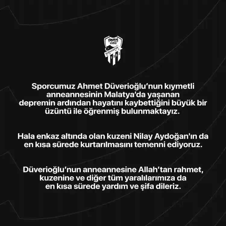 Frutti Extra Bursaspor oyuncusu Ahmet DÜVEROĞLU'nun anneannesi Malatyada yaşanan deprem sonucu hayatını kaybetti.