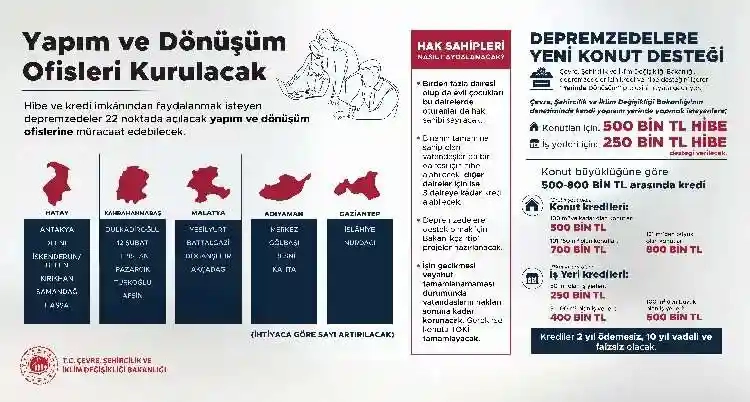Hibe ve kredi imkanından faydalanmak isteyen depremzedeler 22 noktada açılacak yapım ve dönüşüm ofislerine müracaat edebileceği belirtilen açıklamada, afet bölgelerinde ihtiyaca göre sayının arttırabileceği kaydedildi.
