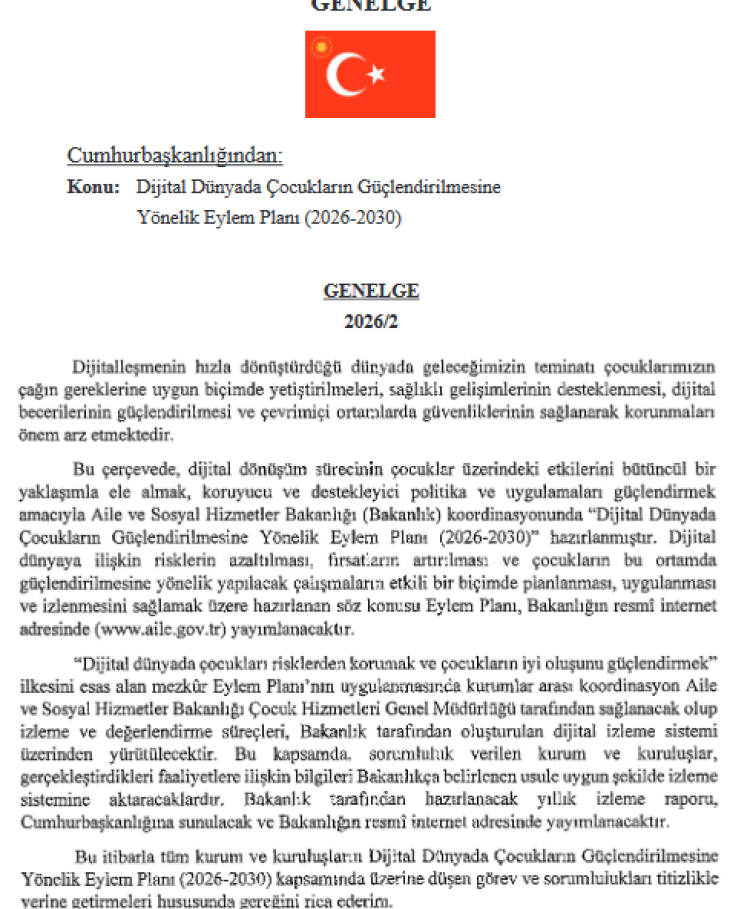 Bugünkü Resmi Gazete’de yayımlanan Cumhurbaşkanlığı Genelgesi ile Dijital Dünyada Çocukların Güçlendirilmesine Yönelik Eylem Planı (2026-2030) genelgesinde, çocukların dijital ortamda karşılaştığı riskleri azaltmayı, bilinçli ve güvenli dijital vatandaşlar olarak yetişmelerini sağlamayı ve bu alanda kamu kurumları ile sivil toplum arasında güçlü bir koordinasyon oluşturması amaçlandı.