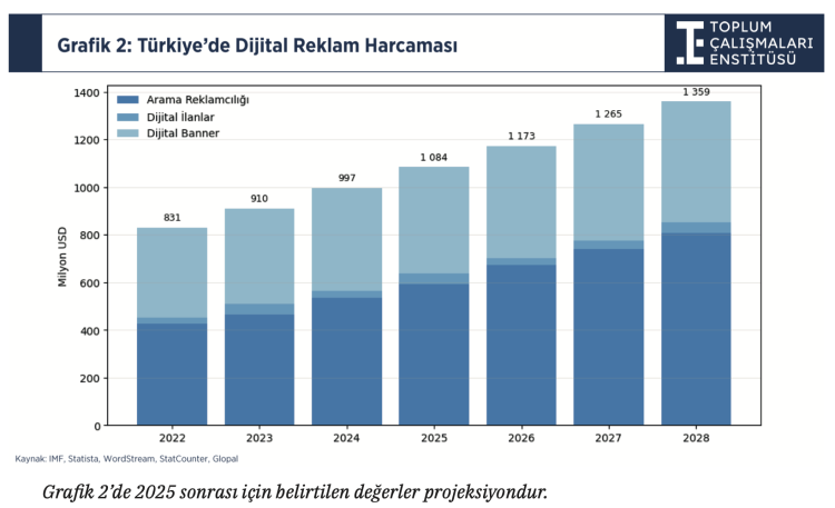 Ankara merkezli düşünce kuruluşu Toplum Çalışmaları Enstitüsü’nün hazırladığı “Dijital Reklamcılık Raporu”, Türkiye’de dijital reklamcılık, genel arama hizmetleri ve mobil uygulama ekosistemindeki yoğunlaşmanın ekonomik etkilerini veri temelli analizlerle ortaya koydu. Rapora, Enstitü Başkanı Av. Dr. Yavuz Selim Günay ile Araştırma ve Veri Analizi Programı Direktörü Yağmur Uzunırmak imza attı.