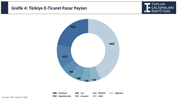 Platform bazlı dağılımda ise; Trendyol yaklaşık yüzde 22, Hepsiburada yaklaşık yüzde 12, n11 yaklaşık yüzde 6, Amazon yaklaşık yüzde 6, PttAVM yaklaşık yüzde 5, Getir yaklaşık yüzde 5, Diğerleri yüzde 43 oranında yer aldı. Raporda “diğerleri” kategorisindeki aktörlerin tüketiciye erişimde büyük ölçüde dijital reklama bağımlı olduğu vurgulandı.